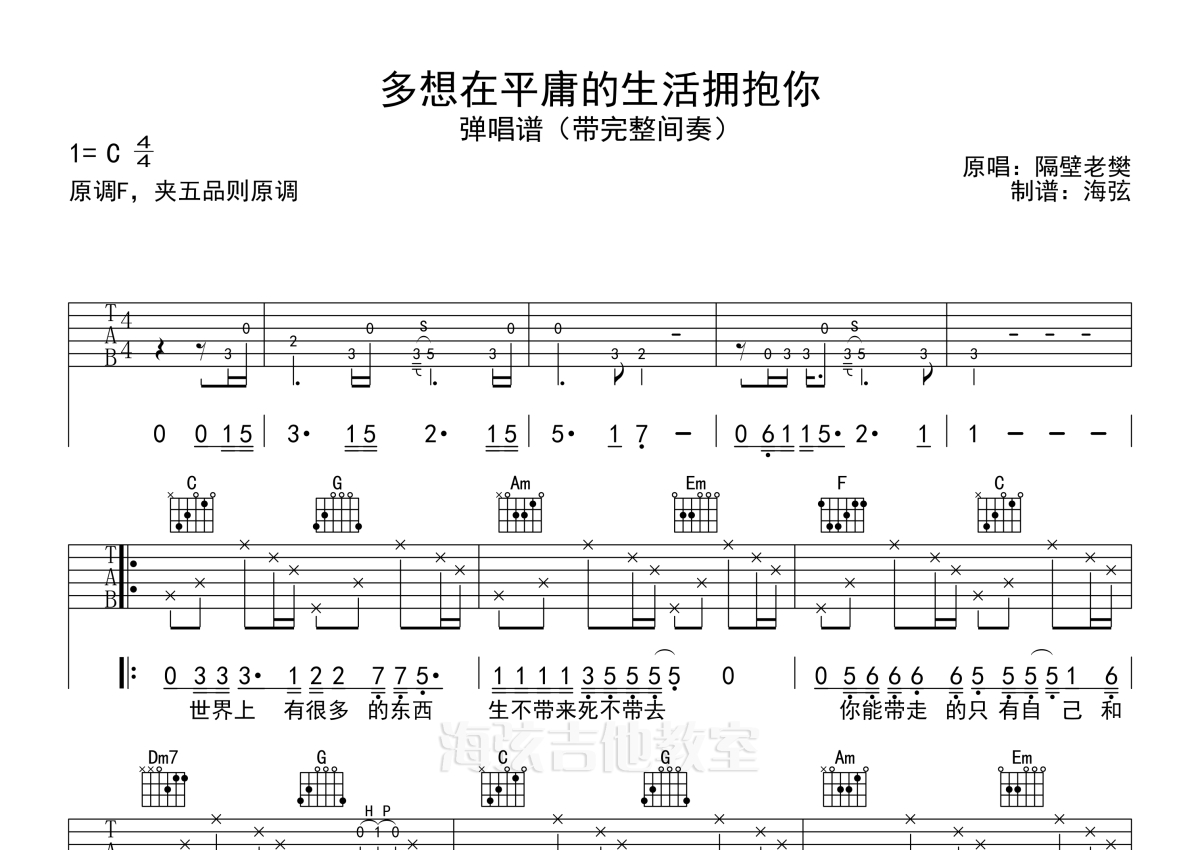 《多想在平庸的生活拥抱你》是隔壁老樊演唱的一首歌曲,拍号为4/4拍,歌曲原调为F调,但由于原调指法比较难,为了方便弹奏,本吉他谱采用的是C调指法编配,变调夹5品弹奏即为原调,当然也可以根据自己的音域改变变调夹位置,或者通过改变和弦调性,以方便自己弹奏,这份吉他谱共有两张高清图谱,图谱由 @海弦 编配上传,图谱使用六线谱编配,包含吉他和弦指法、简谱以及歌词部分,使用这份多想在平庸的生活拥抱你吉他谱,可以让你更加方便地掌握这首歌曲的弹唱技巧,快来尝试吧。