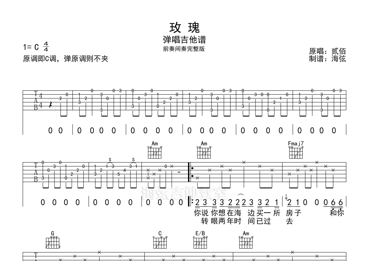 玫瑰吉他谱 - 贰佰 - C调弹唱六线谱