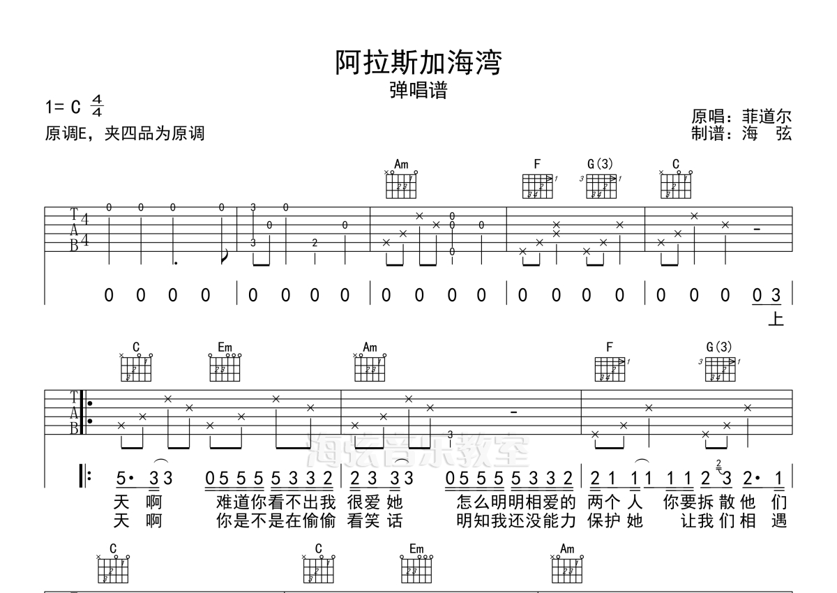 《阿拉斯加海湾》是蓝心羽演唱的一首歌曲,拍号为4/4拍,歌曲原调为E调,但由于原调指法比较难,为了方便弹奏,本吉他谱采用的是C调指法编配,变调夹4品弹奏即为原调,当然也可以根据自己的音域改变变调夹位置,或者通过改变和弦调性,以方便自己弹奏,这份吉他谱共有两张高清图谱,图谱由 @海弦 编配上传,图谱使用六线谱编配,包含吉他和弦指法、简谱以及歌词部分,使用这份阿拉斯加海湾吉他谱,可以让你更加方便地掌握这首歌曲的弹唱技巧,快来尝试吧。