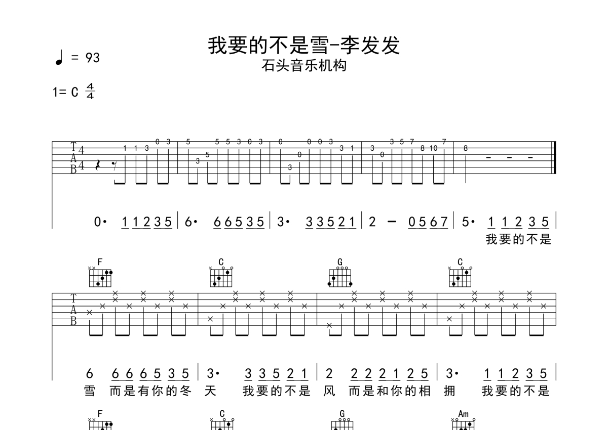 李发发《我要的不是雪》吉他谱 - C调弹唱六线谱 - 石头音乐原版记谱