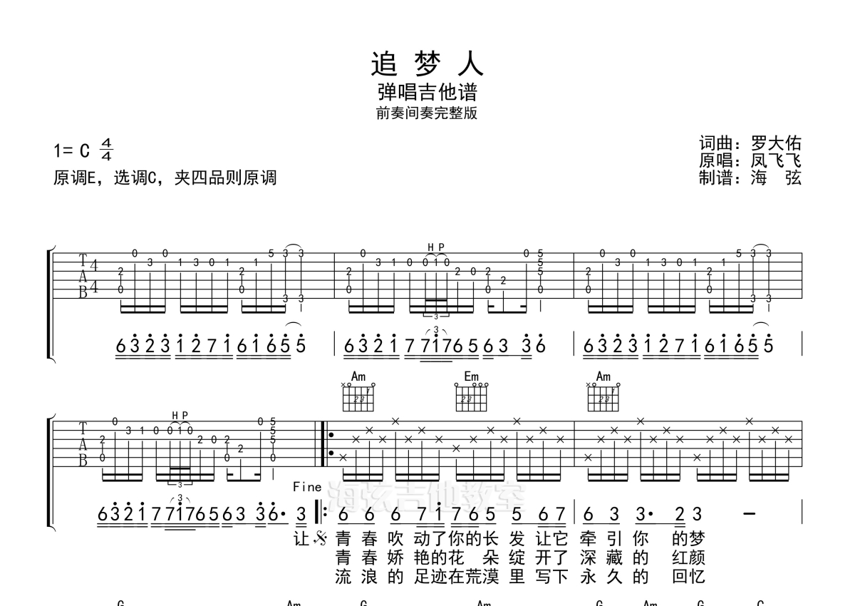追梦人吉他谱 - 凤飞飞 - C调弹唱六线谱