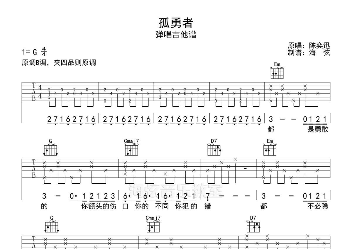 《孤勇者》是陈奕迅演唱的一首歌曲,拍号为4/4拍,歌曲原调为B调,但由于原调指法比较难,为了方便弹奏,本吉他谱采用的是G调指法编配,变调夹4品弹奏即为原调,当然也可以根据自己的音域改变变调夹位置,或者通过改变和弦调性,以方便自己弹奏,这份吉他谱共有两张高清图谱,图谱由 @海弦 编配上传,图谱使用六线谱编配,包含吉他和弦指法、简谱以及歌词部分,使用这份孤勇者吉他谱,可以让你更加方便地掌握这首歌曲的弹唱技巧,快来尝试吧。