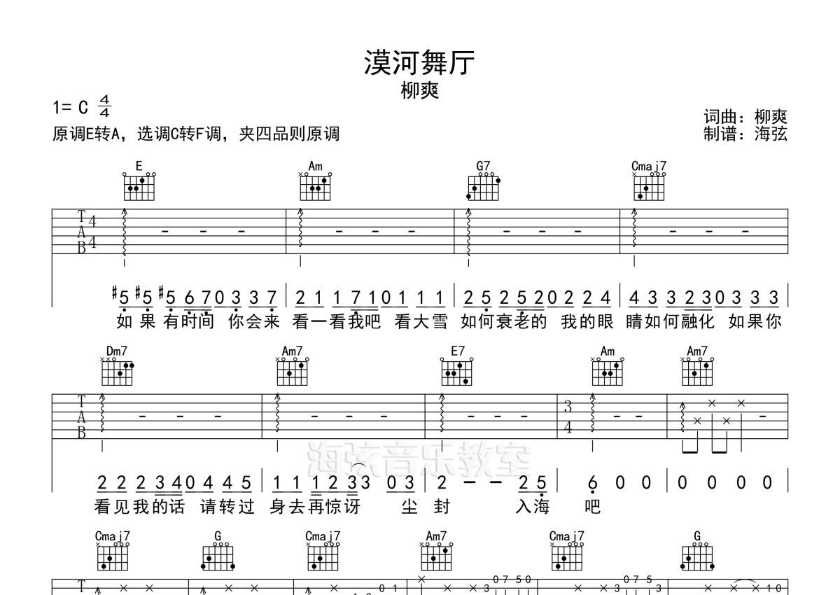 《漠河舞厅》是柳爽演唱的一首歌曲,拍号为4/4拍,歌曲原调为E调,但由于原调指法比较难,为了方便弹奏,本吉他谱采用的是C调指法编配,变调夹4品弹奏即为原调,当然也可以根据自己的音域改变变调夹位置,或者通过改变和弦调性,以方便自己弹奏,这份吉他谱共有四张高清图谱,图谱由 @海弦 编配上传,图谱使用六线谱编配,包含吉他和弦指法、简谱以及歌词部分,使用这份漠河舞厅吉他谱,可以让你更加方便地掌握这首歌曲的弹唱技巧,快来尝试吧。