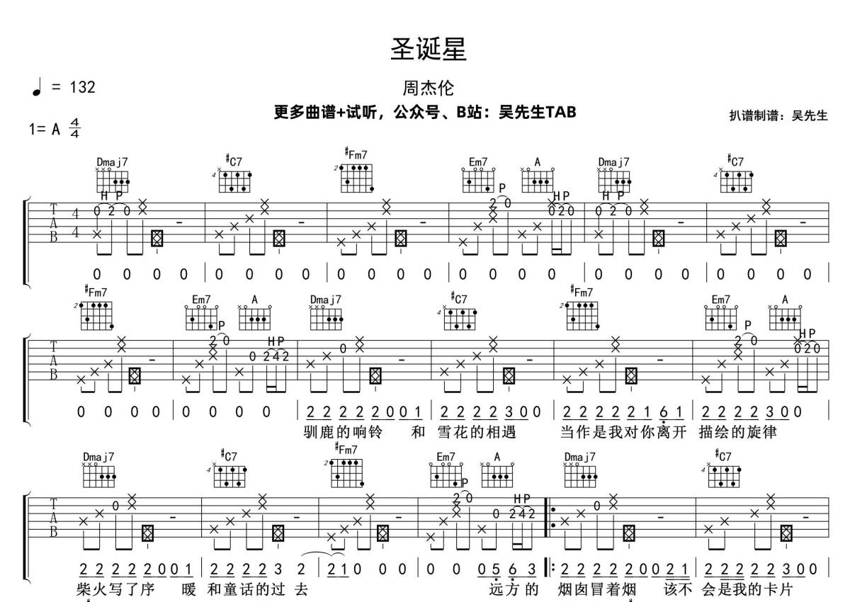 周杰伦《圣诞星》吉他谱 - A调弹唱六线谱