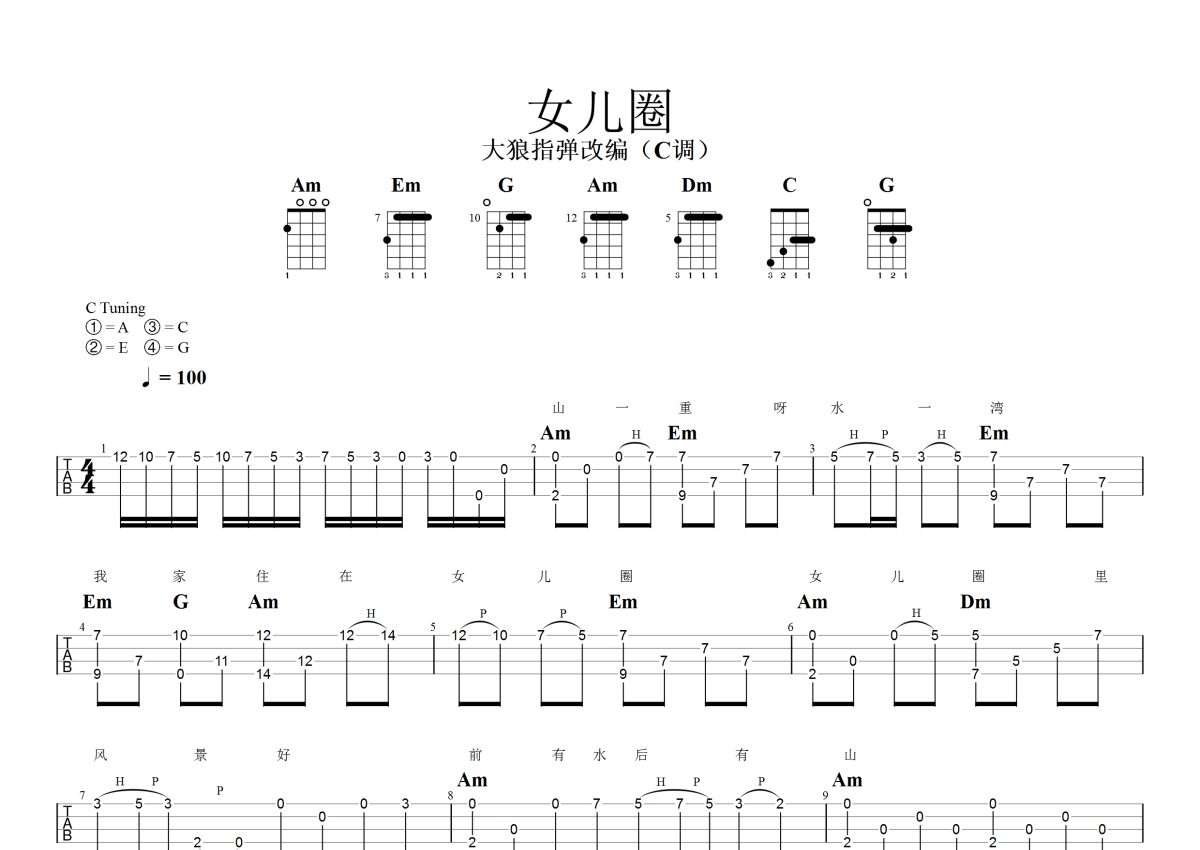 《女儿圈》是韩宝仪演唱的一首歌曲,指弹独奏,拍号为4/4拍,本尤克里里谱采用的是C调指法编配,这份尤克里里谱共有三张高清图谱,图谱由 @大狼指弹 编配上传,图谱使用四线谱编配,曲谱配备了相关的音频提供试听,使用这份女儿圈尤克里里谱,可以让你更加方便地掌握这首歌曲的演奏技巧,快来尝试吧。