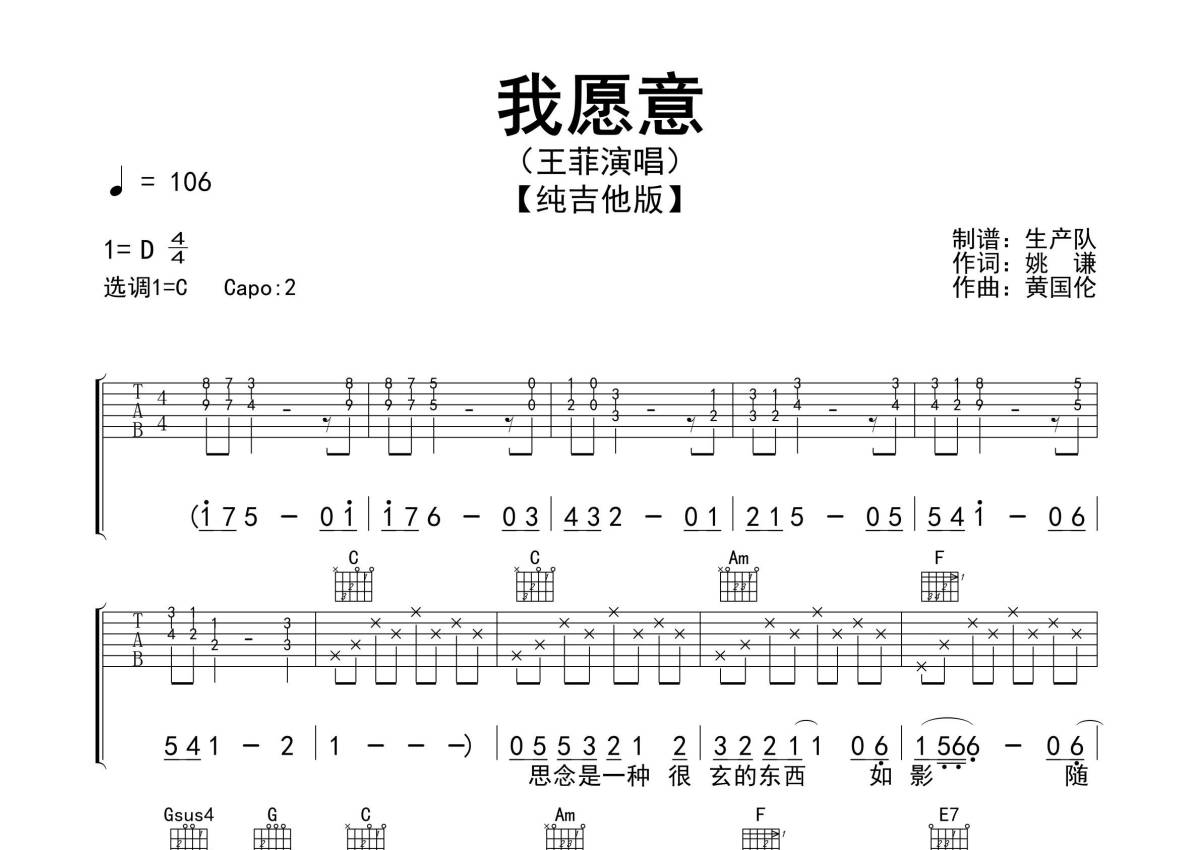 《我愿意》是王菲演唱的一首歌曲,纯吉他版,拍号为4/4拍,歌曲速度为每分钟106拍,歌曲原调为D调,但由于原调指法比较难,为了方便弹奏,本吉他谱采用的是C调指法编配,变调夹2品弹奏即为原调,当然也可以根据自己的音域改变变调夹位置,或者通过改变和弦调性,以方便自己弹奏,这份吉他谱共有两张高清图谱,图谱由 @生产队 编配上传,图谱使用六线谱编配,包含吉他和弦指法、简谱以及歌词部分,使用这份我愿意吉他谱,可以让你更加方便地掌握这首歌曲的弹唱技巧,快来尝试吧。《我愿意》是王菲演唱的歌曲,由姚谦作词,黄国伦作曲,该曲是王菲的早期代表作之一 。本吉他谱根据原版C调指法编配,双音是本曲的亮点,怀旧经典!。