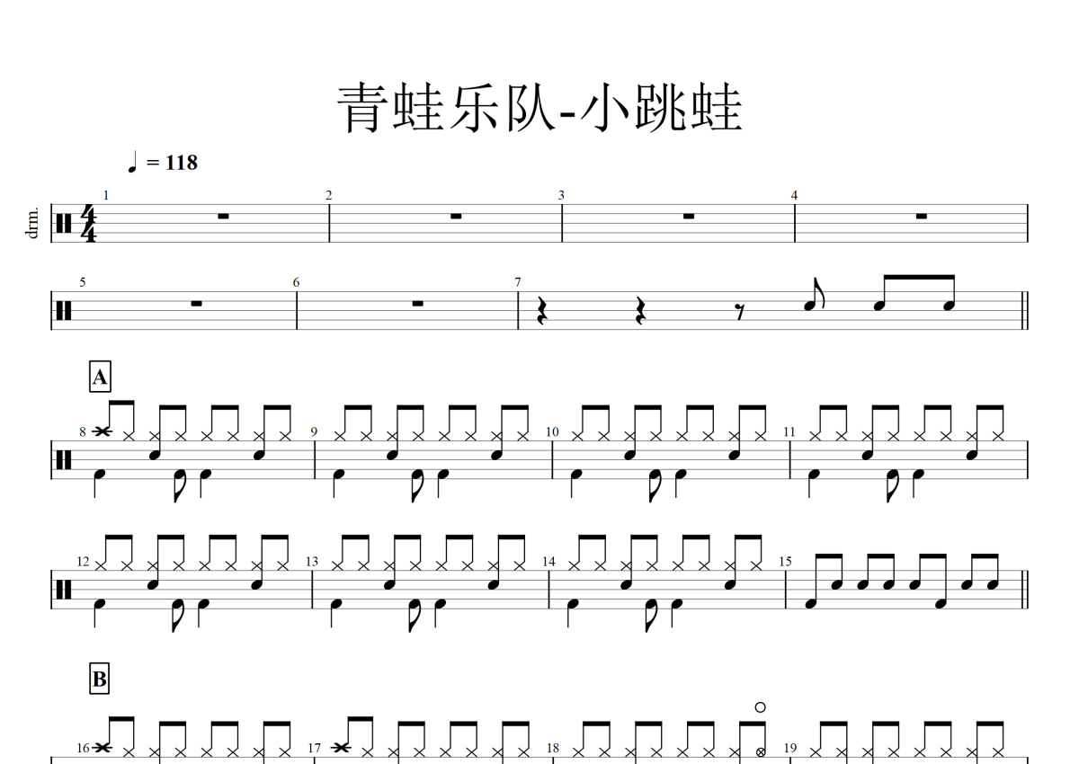《小跳蛙》是青蛙乐队演唱的一首歌曲,拍号为4/4拍,歌曲速度为每分钟118拍,这份架子鼓谱共有两张高清图谱,图谱由 @音符喷血者 编配上传,图谱使用五线谱编配,使用这份小跳蛙架子鼓谱,你将能够轻松地敲打出这首青蛙乐队的小跳蛙,快来尝试吧。
