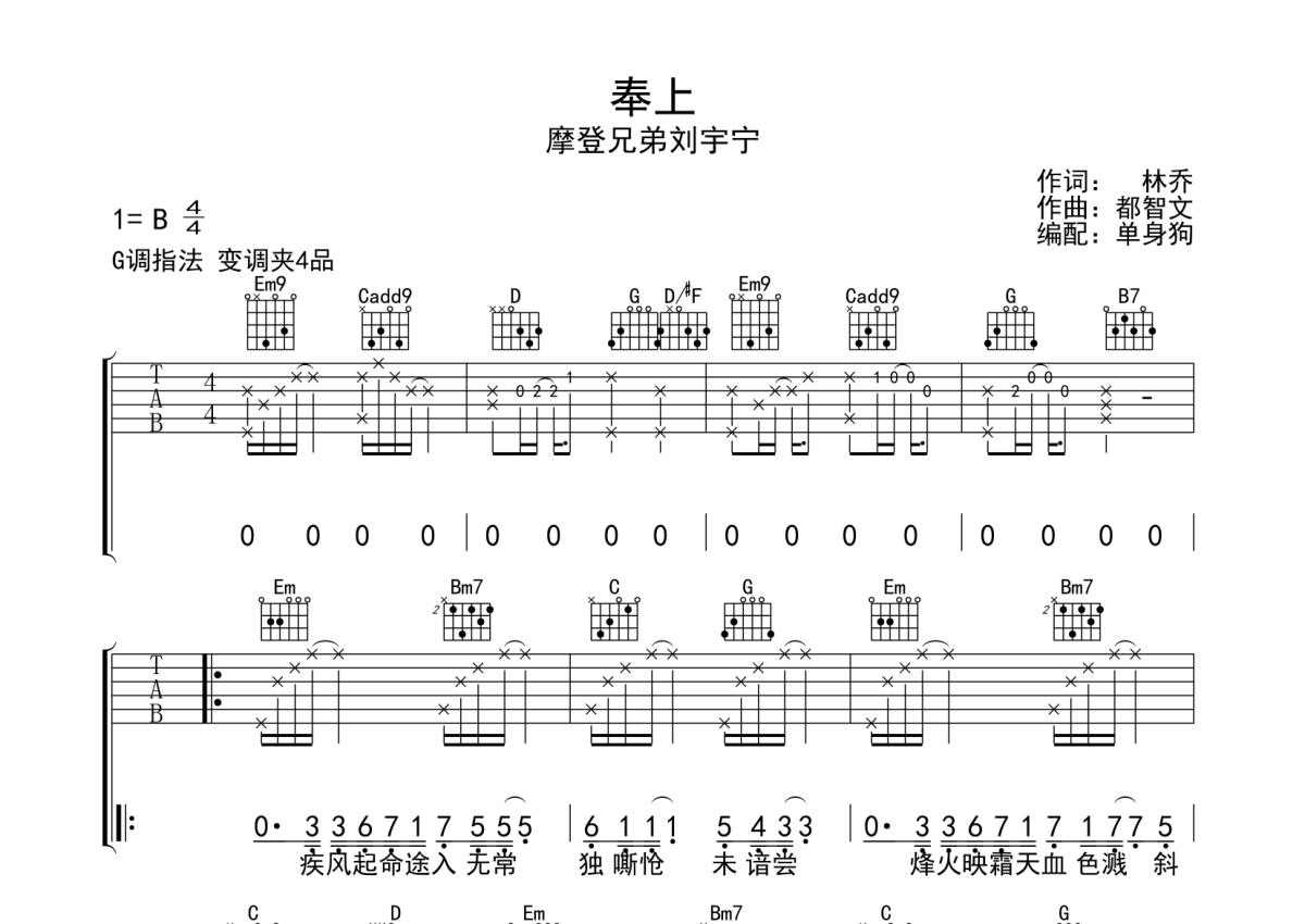 《奉上》是摩登兄弟刘宇宁演唱的一首歌曲,拍号为4/4拍,歌曲原调为B调,但由于原调指法比较难,为了方便弹奏,本吉他谱采用的是G调指法编配,变调夹4品弹奏即为原调,当然也可以根据自己的音域改变变调夹位置,或者通过改变和弦调性,以方便自己弹奏,这份吉他谱共有三张高清图谱,图谱由 @单身狗 编配上传,图谱使用六线谱编配,包含吉他和弦指法、简谱以及歌词部分,使用这份奉上吉他谱,可以让你更加方便地掌握这首歌曲的弹唱技巧,快来尝试吧。