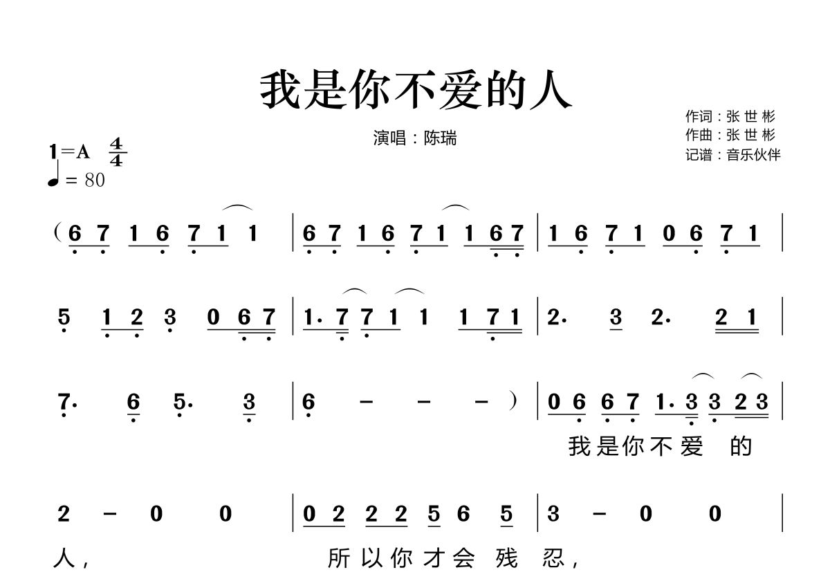 《我是你不爱的人》是陈瑞演唱的一首歌曲,这份简谱共有两张高清图谱,图谱由 @音乐伙伴 编配上传。