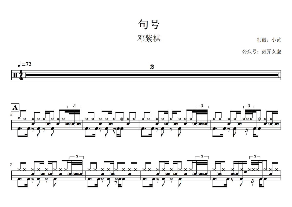 《句号》是邓紫棋演唱的一首歌曲,拍号为4/4拍,歌曲速度为每分钟72拍,这份架子鼓谱共有三张高清图谱,图谱由 @小黄 编配上传,图谱使用五线谱编配,使用这份句号架子鼓谱,你将能够轻松地敲打出这首邓紫棋的句号,快来尝试吧。