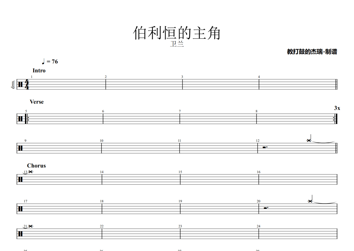 《伯利恒的主角》是卫兰演唱的一首歌曲,拍号为4/4拍,歌曲速度为每分钟76拍,这份架子鼓谱共有两张高清图谱,图谱由 @Jerry 编配上传,图谱使用五线谱编配,使用这份伯利恒的主角架子鼓谱,你将能够轻松地敲打出这首卫兰的伯利恒的主角,快来尝试吧。