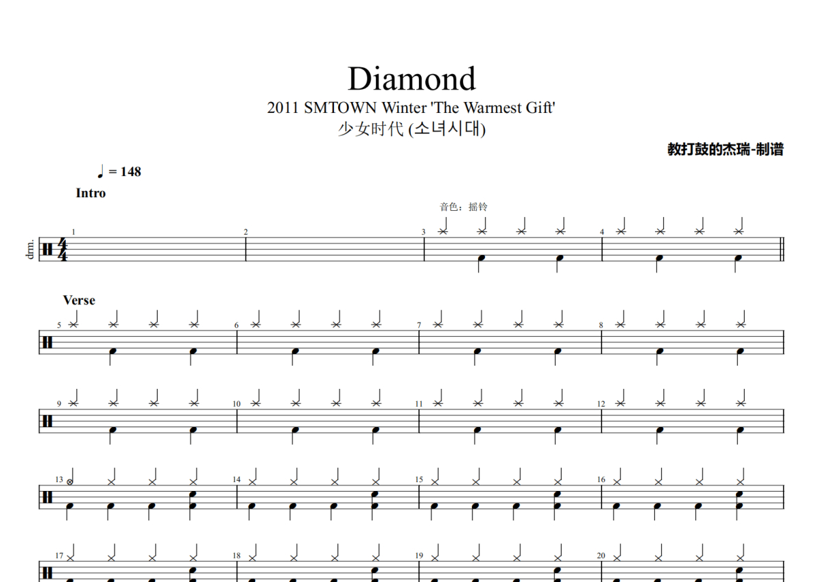 《Diamond》是少女时代 (소녀시대)演唱的一首歌曲,2011 SMTOWN Winter 'The Warmest Gift',拍号为4/4拍,歌曲速度为每分钟148拍,这份架子鼓谱共有三张高清图谱,图谱由 @Jerry 编配上传,图谱使用五线谱编配,使用这份Diamond架子鼓谱,你将能够轻松地敲打出这首少女时代 (소녀시대)的Diamond,快来尝试吧。