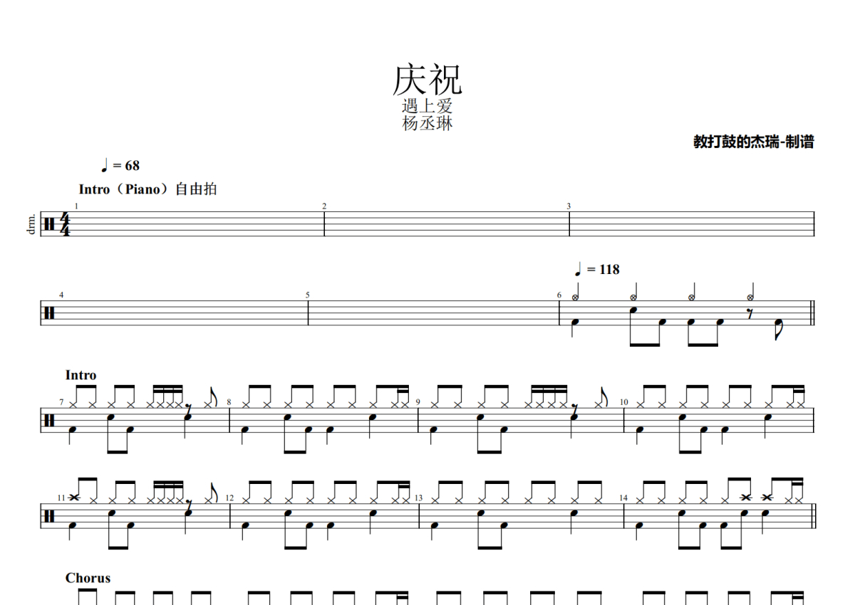 《庆祝》是杨丞琳演唱的一首歌曲,拍号为4/4拍,歌曲速度为每分钟68拍,这份架子鼓谱共有三张高清图谱,图谱由 @Jerry 编配上传,图谱使用五线谱编配,使用这份庆祝架子鼓谱,你将能够轻松地敲打出这首杨丞琳的庆祝,快来尝试吧。