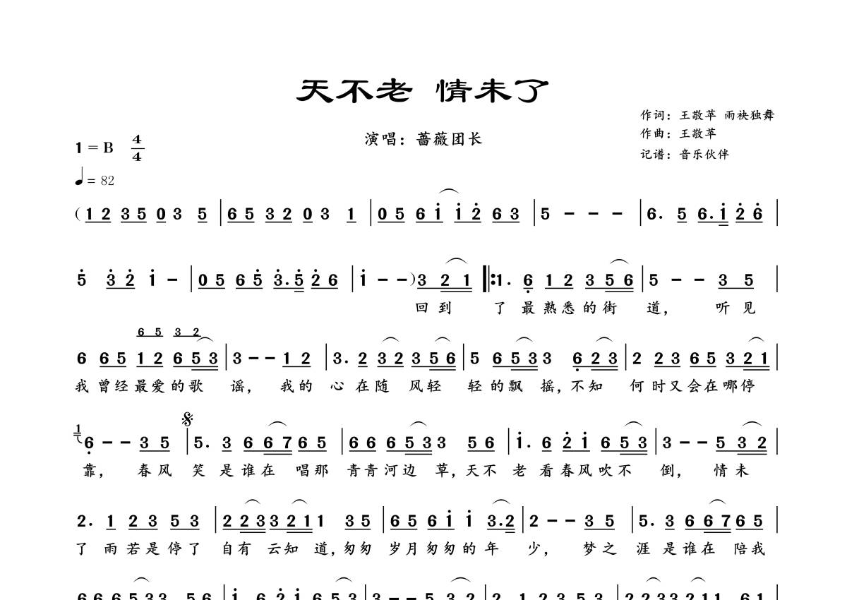《天不老 情未了》是蔷薇团长演唱的一首歌曲,拍号为4/4拍,歌曲速度为每分钟82拍,这份简谱共有一张高清图谱,图谱由 @音乐伙伴 编配上传。