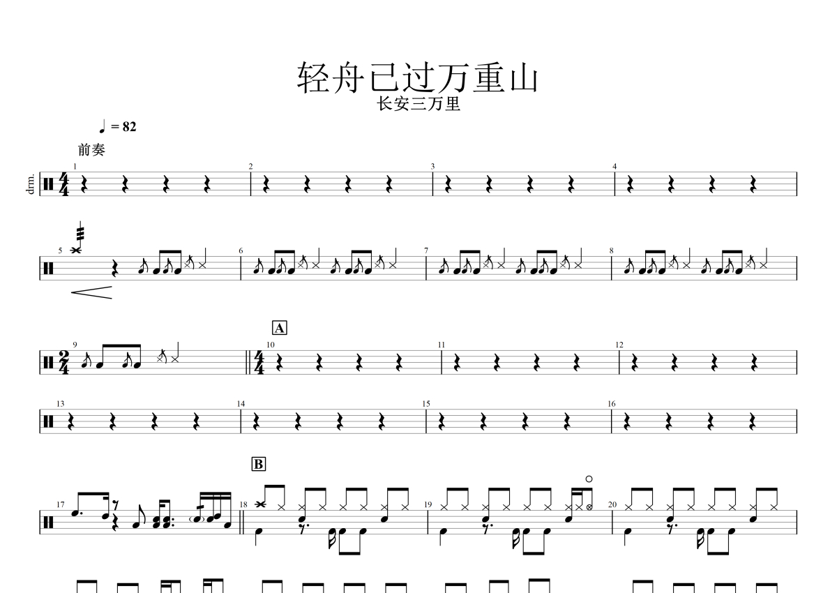 《轻舟已过万重山》是长安三万里演唱的一首歌曲,拍号为4/4拍,歌曲速度为每分钟82拍,这份架子鼓谱共有两张高清图谱,图谱由 @小东鼓谱 编配上传,图谱使用五线谱编配,使用这份轻舟已过万重山架子鼓谱,你将能够轻松地敲打出这首长安三万里的轻舟已过万重山,快来尝试吧。
