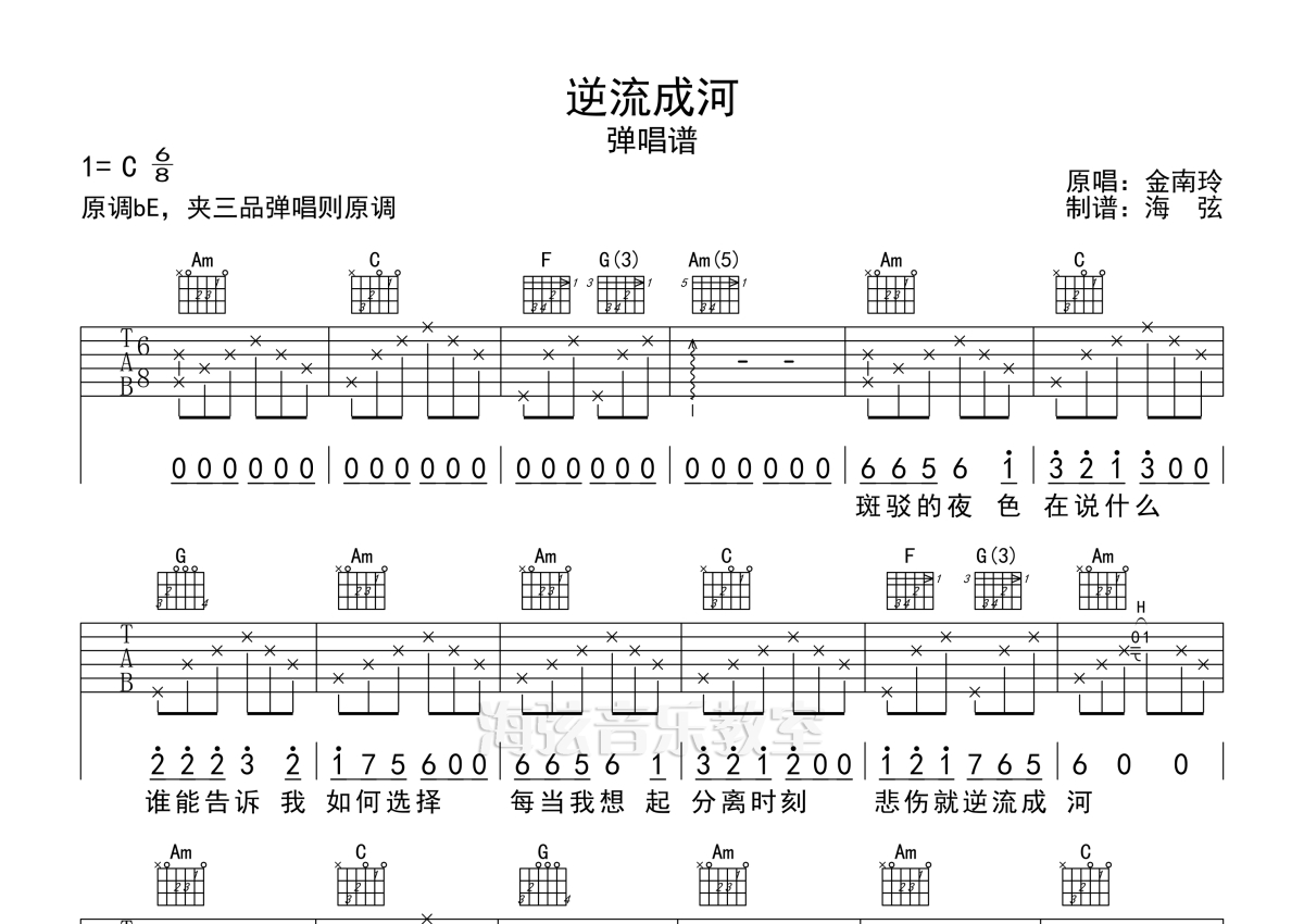 《逆流成河》是金南玲演唱的一首歌曲,拍号为6/8拍,歌曲原调为Eb调,但由于原调指法比较难,为了方便弹奏,本吉他谱采用的是C调指法编配,变调夹3品弹奏即为原调,当然也可以根据自己的音域改变变调夹位置,或者通过改变和弦调性,以方便自己弹奏,这份吉他谱共有两张高清图谱,图谱由 @海弦 编配上传,图谱使用六线谱编配,包含吉他和弦指法、简谱以及歌词部分,使用这份逆流成河吉他谱,可以让你更加方便地掌握这首歌曲的弹唱技巧,快来尝试吧。