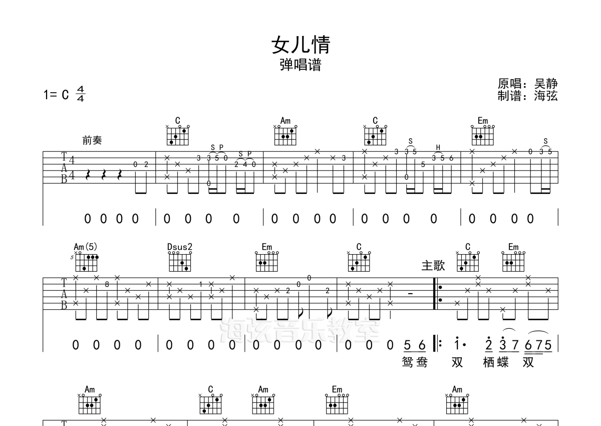 吴静《女儿情》吉他谱 - C调弹唱六线谱