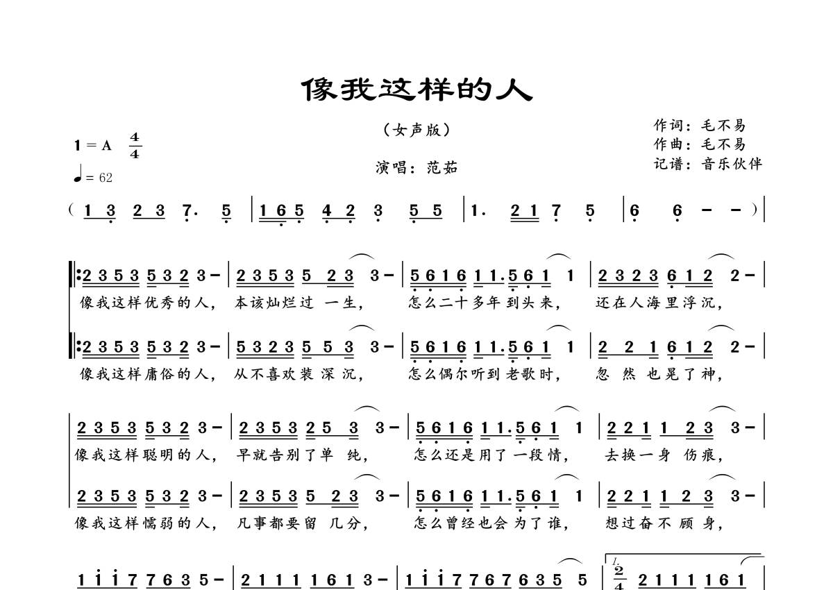 《像我这样的人》是范茹演唱的一首歌曲,女声版,拍号为4/4拍,歌曲速度为每分钟62拍,这份简谱共有一张高清图谱,图谱由 @音乐伙伴 编配上传。