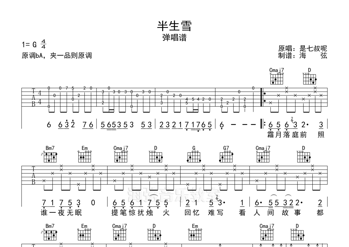 《半生雪》是是七叔呢演唱的一首歌曲,拍号为4/4拍,歌曲原调为Ab调,但由于原调指法比较难,为了方便弹奏,本吉他谱采用的是G调指法编配,变调夹1品弹奏即为原调,当然也可以根据自己的音域改变变调夹位置,或者通过改变和弦调性,以方便自己弹奏,这份吉他谱共有两张高清图谱,图谱由 @海弦 编配上传,图谱使用六线谱编配,包含吉他和弦指法、简谱以及歌词部分,使用这份半生雪吉他谱,可以让你更加方便地掌握这首歌曲的弹唱技巧,快来尝试吧。