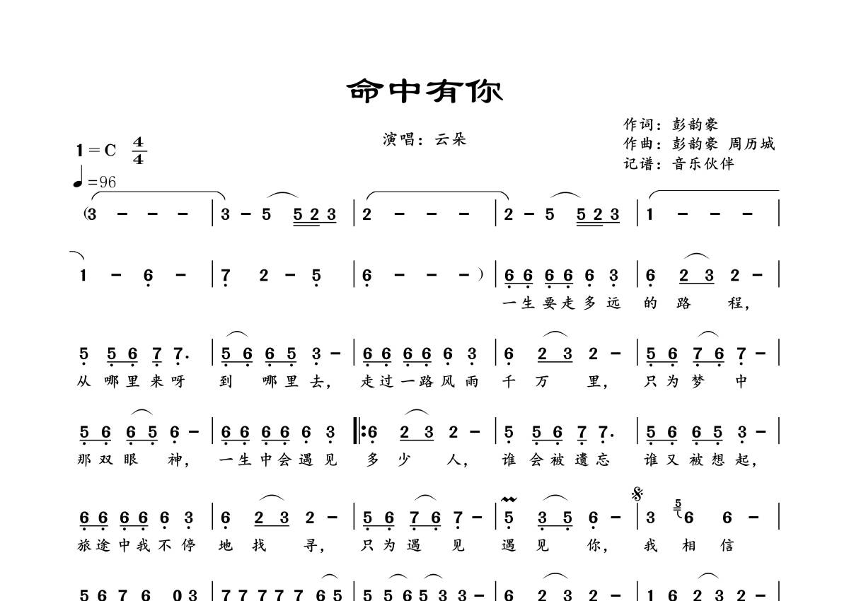 《命中有你》是云朵演唱的一首歌曲,拍号为4/4拍,歌曲速度为每分钟96拍,这份简谱共有一张高清图谱,图谱由 @音乐伙伴 编配上传。