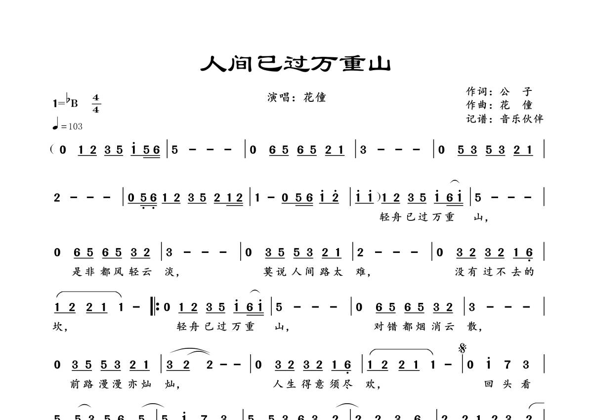 《人间已过万重山》是花僮演唱的一首歌曲,拍号为4/4拍,歌曲速度为每分钟103拍,这份简谱共有一张高清图谱,图谱由 @音乐伙伴 编配上传。