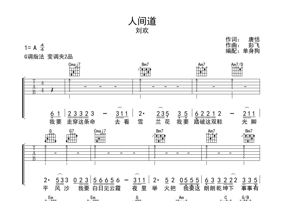 《人间道》是刘欢演唱的一首歌曲,拍号为4/4拍,歌曲原调为A调,但由于原调指法比较难,为了方便弹奏,本吉他谱采用的是G调指法编配,变调夹2品弹奏即为原调,当然也可以根据自己的音域改变变调夹位置,或者通过改变和弦调性,以方便自己弹奏,这份吉他谱共有三张高清图谱,图谱由 @单身狗 编配上传,图谱使用六线谱编配,包含吉他和弦指法、简谱以及歌词部分,使用这份人间道吉他谱,可以让你更加方便地掌握这首歌曲的弹唱技巧,快来尝试吧。
