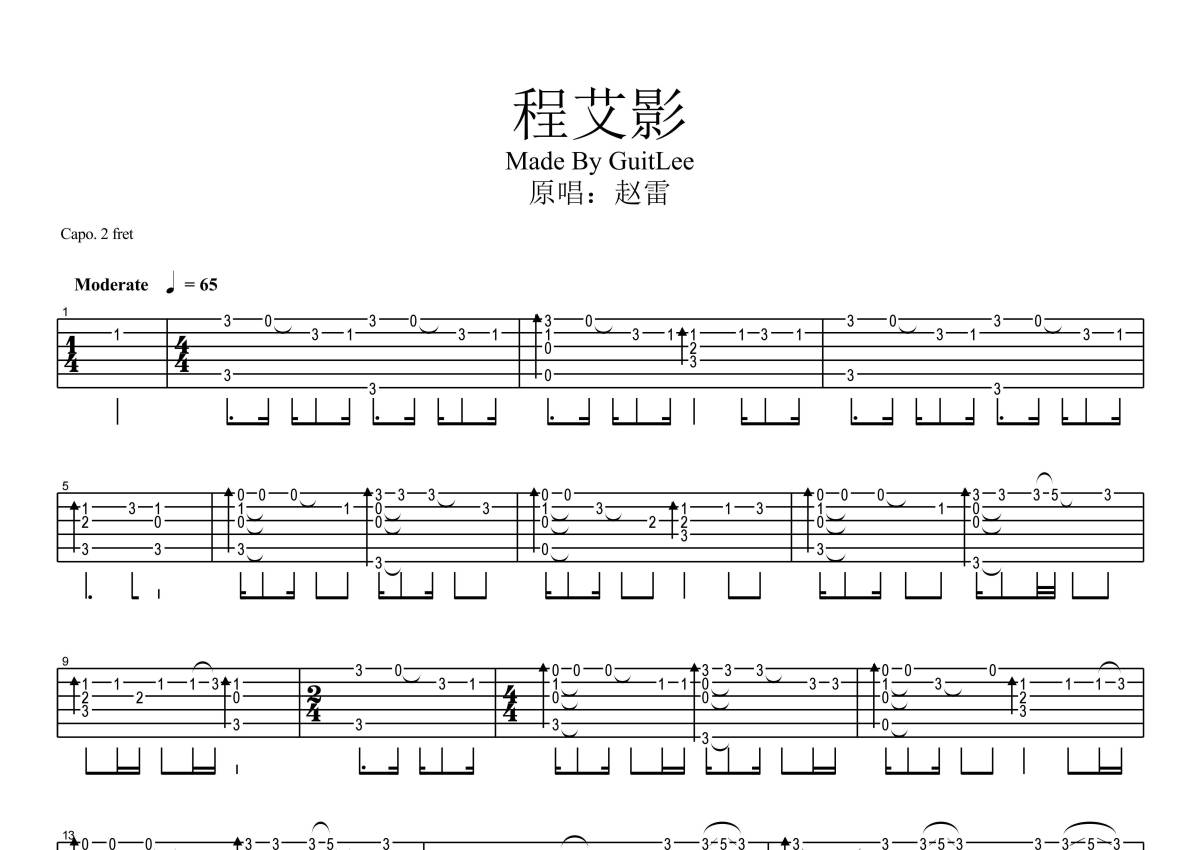《程艾影》是赵雷演唱的一首歌曲,拍号为4/4拍,歌曲原调为D调,但由于原调指法比较难,为了方便弹奏,本吉他谱采用的是D调指法编配,变调夹2品弹奏即为原调,当然也可以根据自己的音域改变变调夹位置,或者通过改变和弦调性,以方便自己弹奏,这份吉他谱共有一张高清图谱,图谱由 @GuitLee! 编配上传,图谱使用六线谱编配,使用这份程艾影吉他谱,可以让你更加方便地掌握这首歌曲的演奏技巧,快来尝试吧。