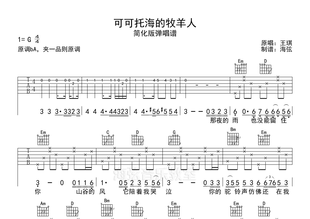《可可托海的牧羊人》是王琪演唱的一首歌曲,拍号为4/4拍,歌曲原调为Ab调,但由于原调指法比较难,为了方便弹奏,本吉他谱采用的是G调指法编配,变调夹1品弹奏即为原调,当然也可以根据自己的音域改变变调夹位置,或者通过改变和弦调性,以方便自己弹奏,这份吉他谱共有两张高清图谱,图谱由 @海弦 编配上传,图谱使用六线谱编配,包含吉他和弦指法、简谱以及歌词部分,使用这份可可托海的牧羊人吉他谱,可以让你更加方便地掌握这首歌曲的弹唱技巧,快来尝试吧。