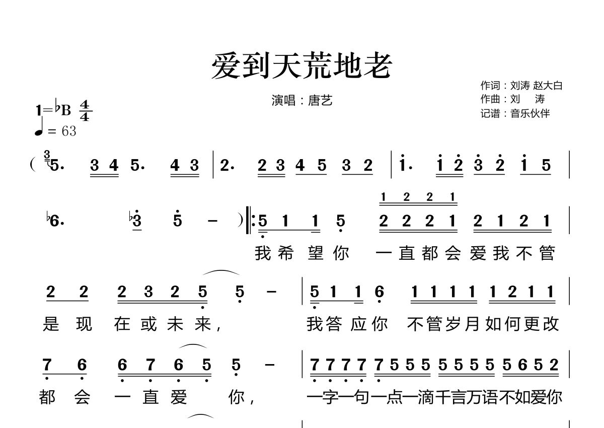 爱到天荒地老简谱 - 唐艺演唱