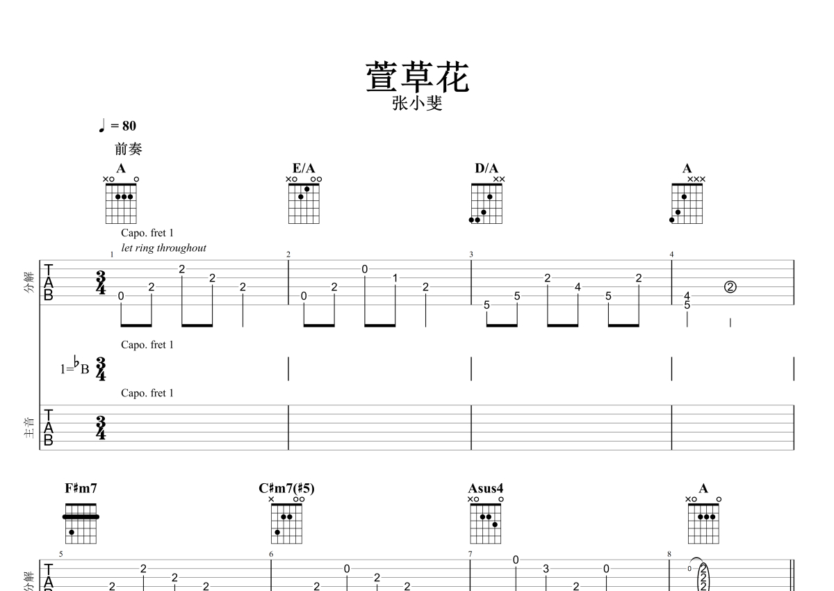 《萱草花》是张小斐演唱的一首歌曲,超级原版有GTP,拍号为3/4拍,歌曲速度为每分钟90拍,歌曲原调为Bb调,但由于原调指法比较难,为了方便弹奏,本吉他谱采用的是A调指法编配,变调夹1品弹奏即为原调,当然也可以根据自己的音域改变变调夹位置,或者通过改变和弦调性,以方便自己弹奏,这份吉他谱共有十张高清图谱,图谱由 @石头音乐 编配上传,图谱使用六线谱编配,包含吉他和弦指法、简谱以及歌词部分,曲谱配备了相关的视频提供浏览,使用这份萱草花吉他谱,可以让你更加方便地掌握这首歌曲的弹唱技巧,快来尝试吧。