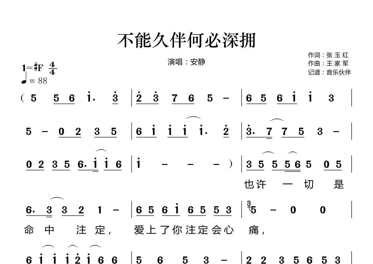 《不能久伴何必深拥》是安静演唱的一首歌曲,拍号为4/4拍,歌曲速度为每分钟88拍,这份简谱共有两张高清图谱,图谱由 @音乐伙伴 编配上传。