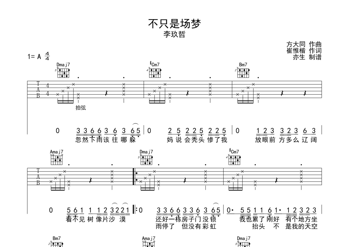 李玖哲《不只是场梦》吉他谱 - A调弹唱六线谱