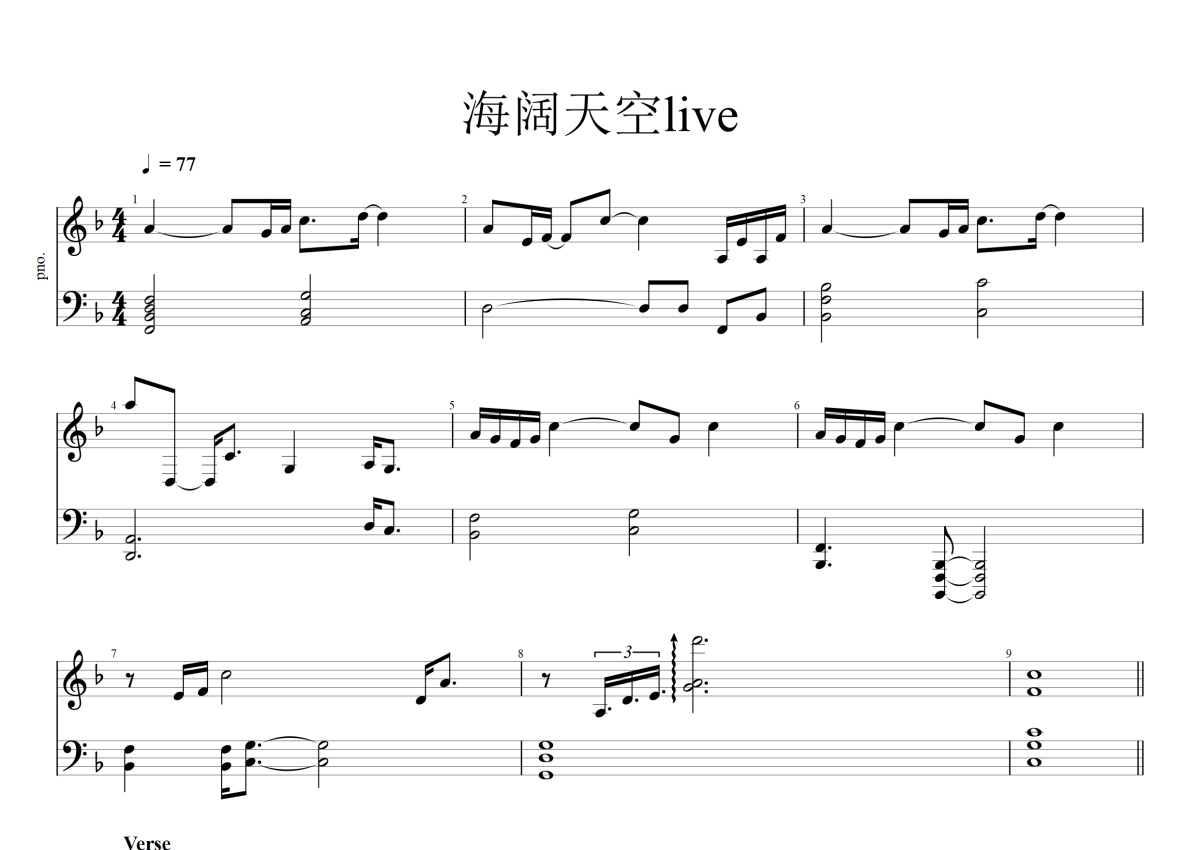 《海阔天空》是陈小春、MC HotDog 热狗、GAI周延、林志炫、言承旭演唱的一首歌曲,Live,拍号为4/4拍,歌曲速度为每分钟77拍,这份钢琴谱共有五张高清图谱,图谱由 @Golder 编配上传,曲谱配备了相关的音频提供试听,使用这份海阔天空钢琴谱,可以让你更加方便地掌握这首歌曲的弹唱技巧,快来尝试吧。