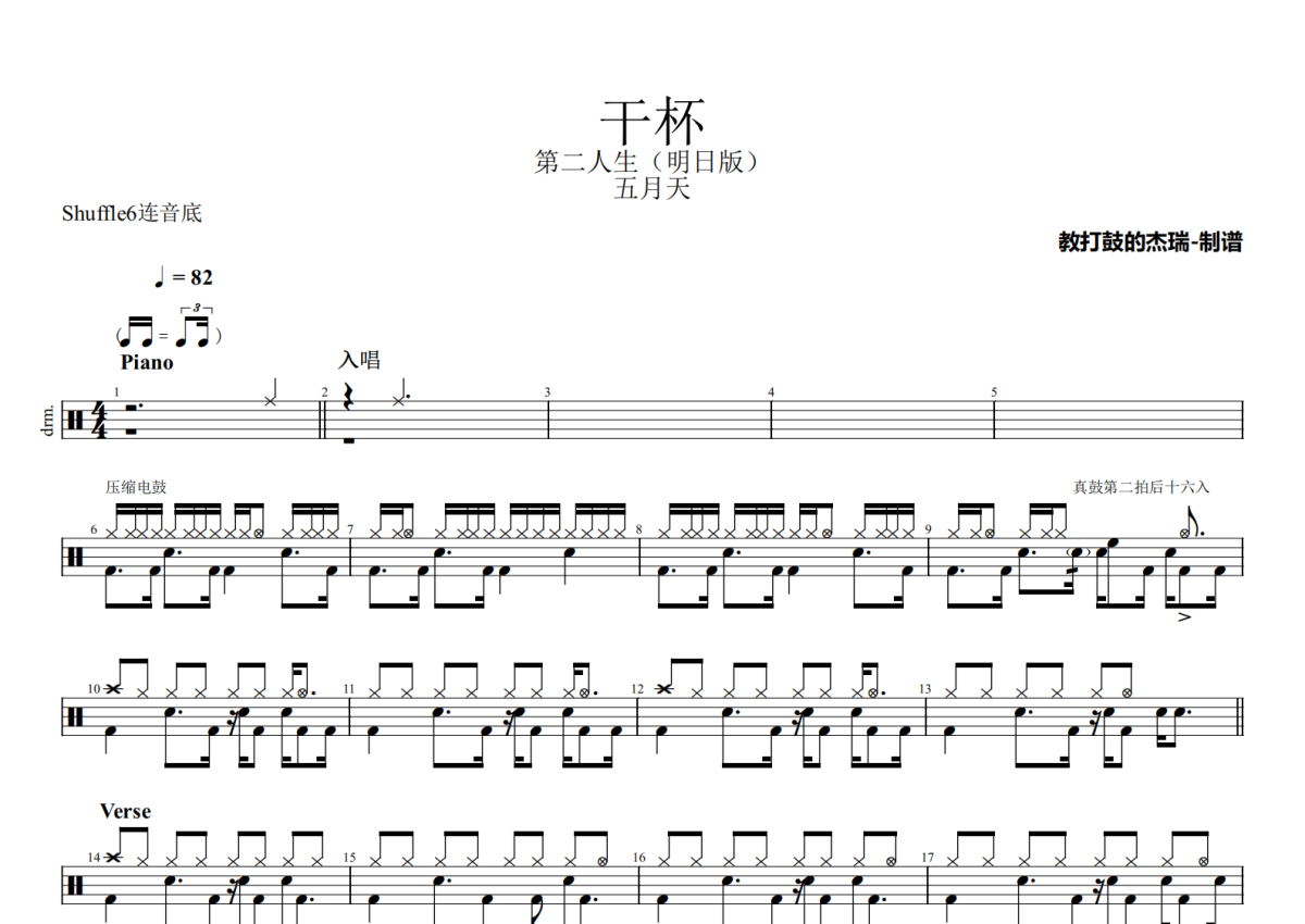 《干杯》是五月天演唱的一首歌曲,拍号为4/4拍,歌曲速度为每分钟82拍,这份架子鼓谱共有三张高清图谱,图谱由 @Jerry 编配上传,图谱使用五线谱编配,使用这份干杯架子鼓谱,你将能够轻松地敲打出这首五月天的干杯,快来尝试吧。