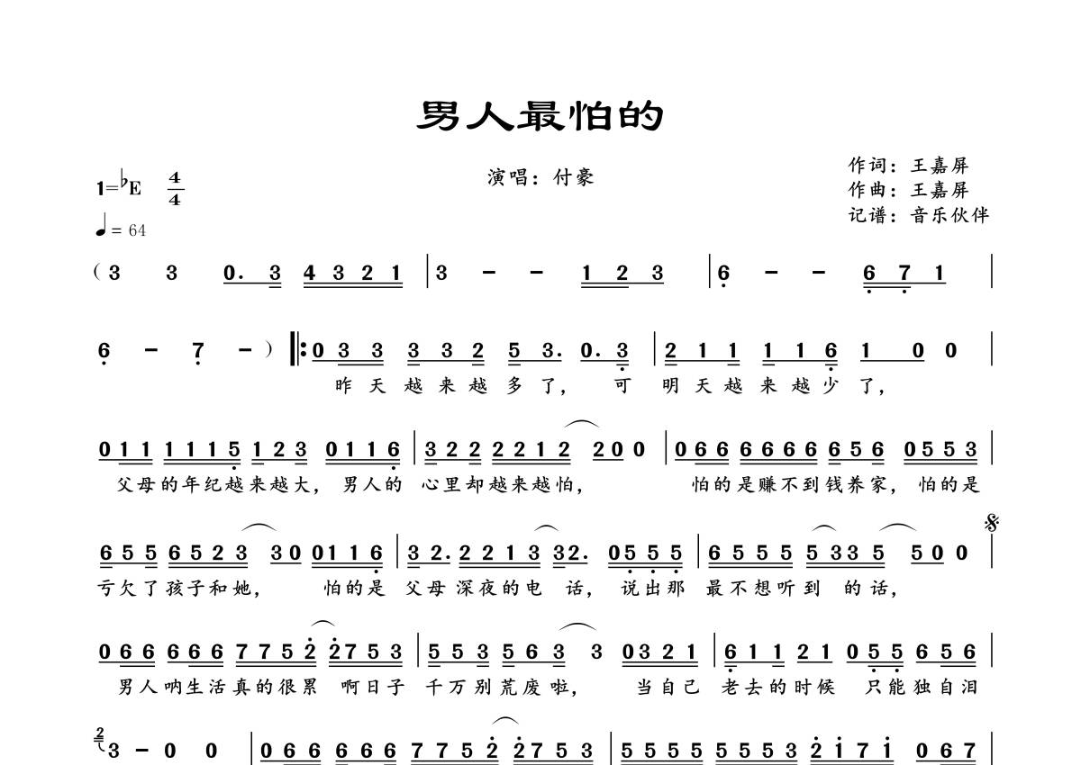 《男人最怕的》是付豪演唱的一首歌曲,拍号为4/4拍,歌曲速度为每分钟64拍,这份简谱共有一张高清图谱,图谱由 @音乐伙伴 编配上传。