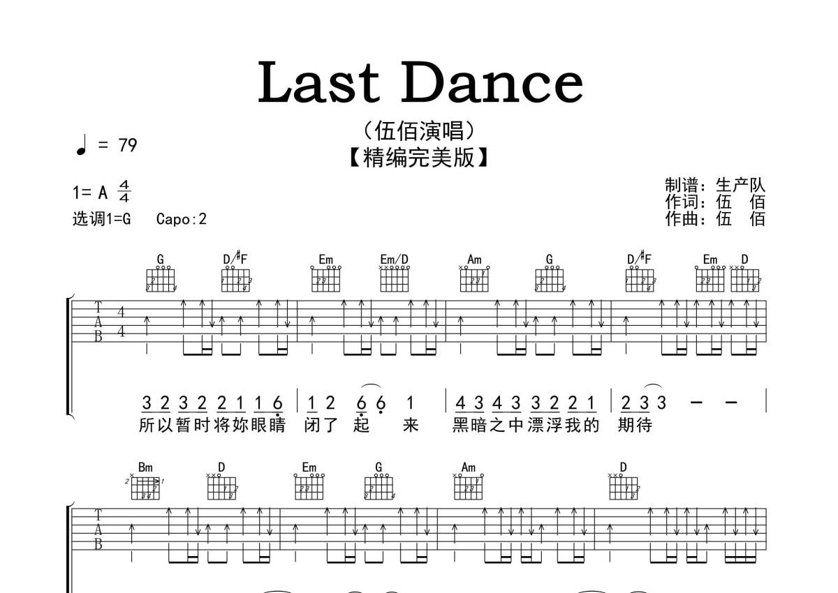 《Last Dance》是伍佰演唱的一首歌曲,精编完美版,拍号为4/4拍,歌曲速度为每分钟79拍,歌曲原调为G调,本吉他谱采用的是G调指法编配,变调夹2品弹奏即为原调,当然也可以根据自己的音域改变变调夹位置,或者通过改变和弦调性,以方便自己弹奏,这份吉他谱共有三张高清图谱,图谱由 @生产队 编配上传,图谱使用六线谱编配,包含吉他和弦指法、简谱以及歌词部分,使用这份Last Dance吉他谱,可以让你更加方便地掌握这首歌曲的弹唱技巧,快来尝试吧。《Last Dance》是由伍佰作词、作曲并演唱的经典歌曲,收录在专辑《爱情的尽头》中 ,该歌曲是2019年播出的电视剧《想见你》的插曲。本吉他谱根据原版G调指法编配,精准的间奏、尾奏和Solo,扫弦节奏编配,怀旧经典!。