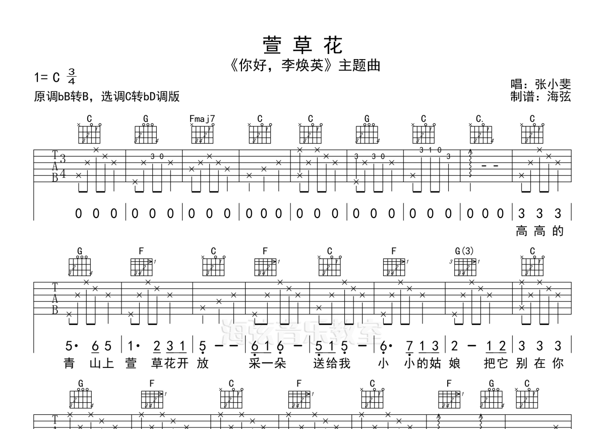 《萱草花》是张小斐演唱的一首歌曲,拍号为3/4拍,歌曲原调为Bb调,但由于原调指法比较难,为了方便弹奏,本吉他谱采用的是C调指法编配,这份吉他谱共有两张高清图谱,图谱由 @海弦 编配上传,图谱使用六线谱编配,包含吉他和弦指法、简谱以及歌词部分,使用这份萱草花吉他谱,可以让你更加方便地掌握这首歌曲的弹唱技巧,快来尝试吧。