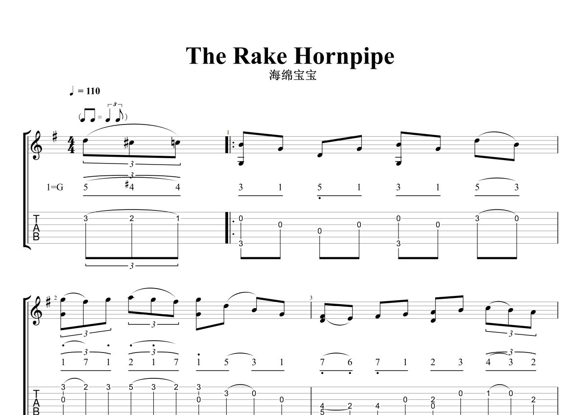 《The Rake Hornpipe》是海绵宝宝演唱的一首歌曲,石头音乐原版记谱,拍号为4/4拍,歌曲速度为每分钟110拍,歌曲原调为G调,本吉他谱采用的是G调指法编配,演奏时不需要使用变调夹即为原调,这份吉他谱共有四张高清图谱,图谱由 @石头音乐 编配上传,图谱使用六线谱编配,曲谱配备了相关的音频提供试听,使用这份The Rake Hornpipe吉他谱,可以让你更加方便地掌握这首歌曲的演奏技巧,快来尝试吧。有GTP/PDF。