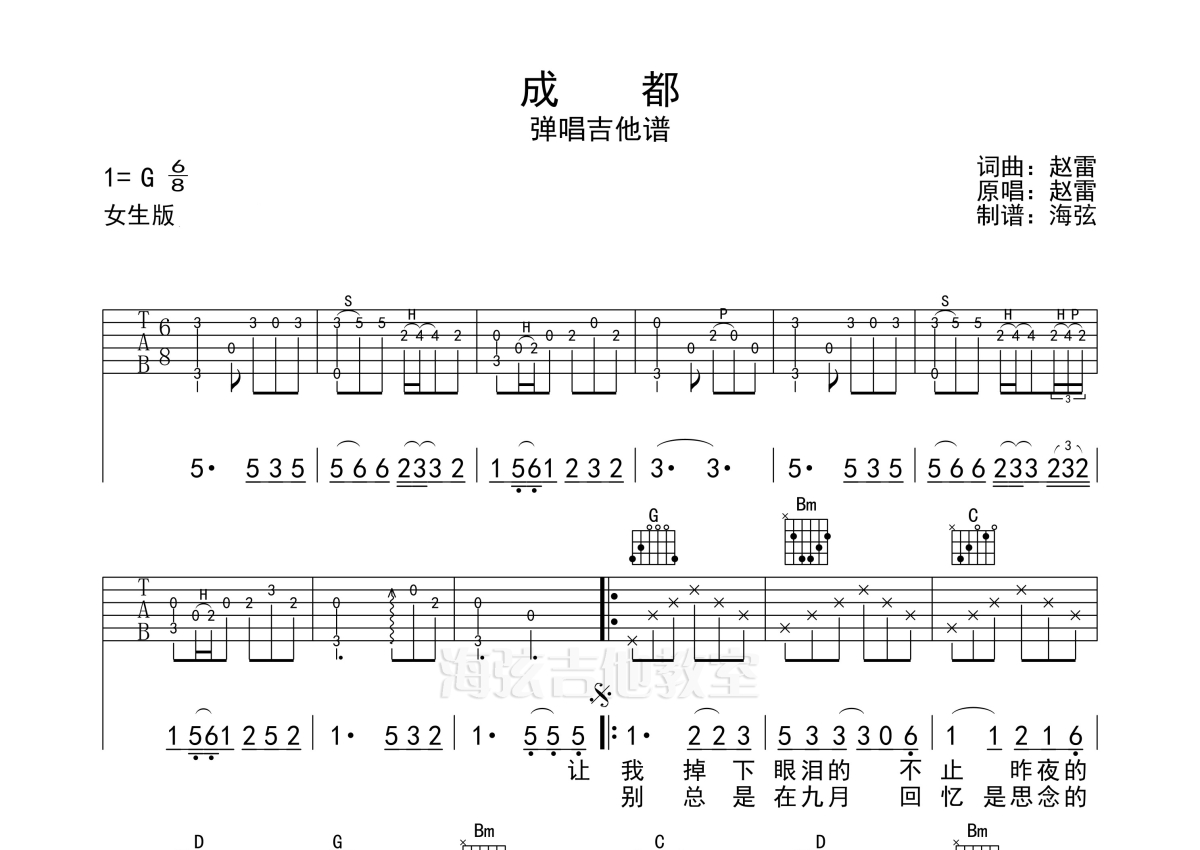 赵雷《成都》吉他谱 - G调弹唱六线谱