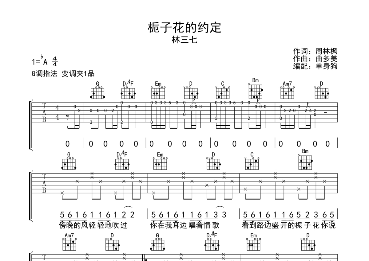 栀子花的约定吉他谱 - 林三七 - G调弹唱六线谱