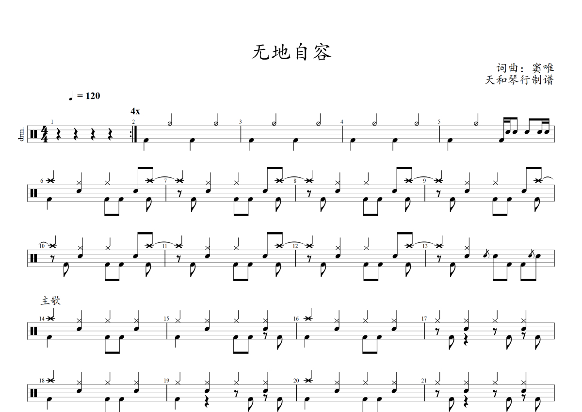 《无地自容》是黑豹乐队演唱的一首歌曲,拍号为4/4拍,歌曲速度为每分钟120拍,这份架子鼓谱共有四张高清图谱,图谱由 @音符喷血者 编配上传,图谱使用五线谱编配,使用这份无地自容架子鼓谱,你将能够轻松地敲打出这首黑豹乐队的无地自容,快来尝试吧。