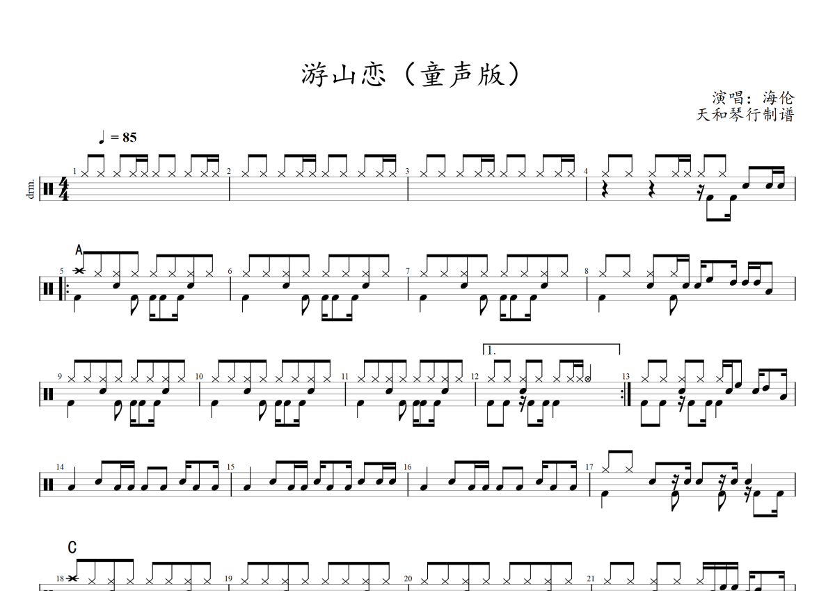 《游山恋》是海伦演唱的一首歌曲,童声版,拍号为4/4拍,歌曲速度为每分钟85拍,这份架子鼓谱共有两张高清图谱,图谱由 @音符喷血者 编配上传,图谱使用五线谱编配,使用这份游山恋架子鼓谱,你将能够轻松地敲打出这首海伦的游山恋,快来尝试吧。