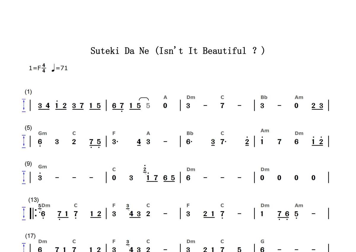 《最终幻想10 - Suteki Da Ne(素敵だね)》是Nobuo Uematsu演唱的一首歌曲,拍号为4/4拍,歌曲速度为每分钟71拍,这份简谱共有两张高清图谱,图谱由 @Golder 编配上传。
