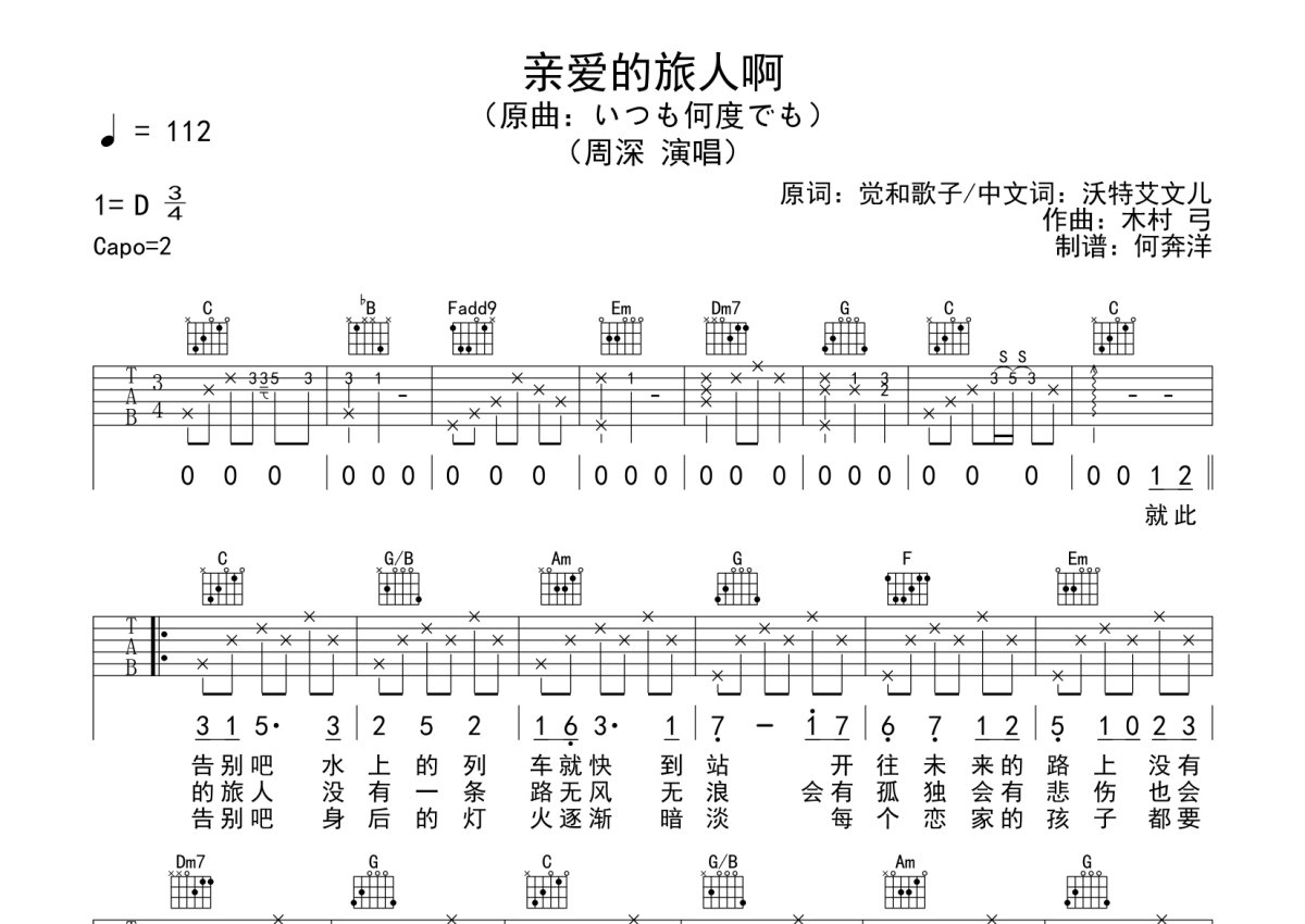 《亲爱的旅人啊》是周深演唱的一首歌曲,本吉他谱采用的是C调指法编配,这份吉他谱共有两张高清图谱,图谱由 @何奔洋 编配上传,图谱使用六线谱编配,包含吉他和弦指法、简谱以及歌词部分,使用这份亲爱的旅人啊吉他谱,可以让你更加方便地掌握这首歌曲的弹唱技巧,快来尝试吧。周深《亲爱的旅人啊》吉他谱_C调吉他弹唱谱。