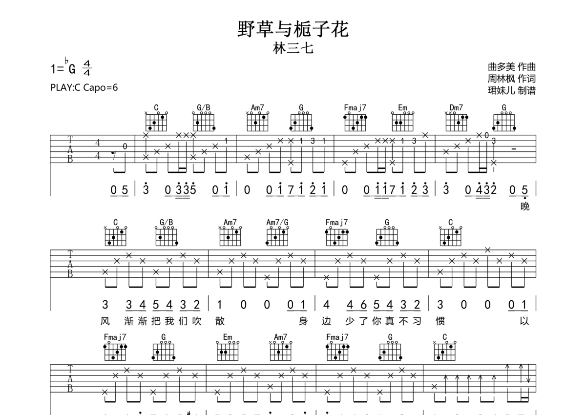 林三七《野草与栀子花》吉他谱 - C调弹唱六线谱
