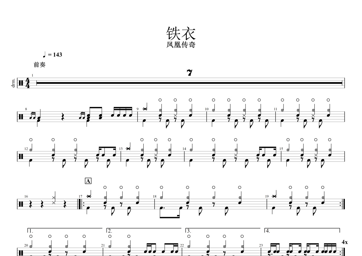 《铁衣》是凤凰传奇演唱的一首歌曲,拍号为4/4拍,歌曲速度为每分钟143拍,这份架子鼓谱共有四张高清图谱,图谱由 @小东鼓谱 编配上传,图谱使用五线谱编配,使用这份铁衣架子鼓谱,你将能够轻松地敲打出这首凤凰传奇的铁衣,快来尝试吧。