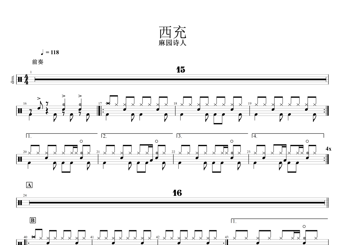 《西充》是麻园诗人演唱的一首歌曲,拍号为4/4拍,歌曲速度为每分钟118拍,这份架子鼓谱共有两张高清图谱,图谱由 @小东鼓谱 编配上传,图谱使用五线谱编配,使用这份西充架子鼓谱,你将能够轻松地敲打出这首麻园诗人的西充,快来尝试吧。