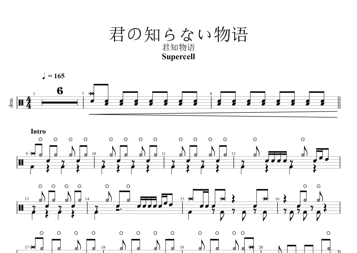 《君の知らない物语》是Supercell演唱的一首歌曲,这份鼓谱共有六张高清图谱,图谱由 @打鼓谱 编配上传,图谱使用五线谱编配,使用这份君の知らない物语架子鼓谱,你将能够轻松地敲打出这首Supercell的君の知らない物语,快来尝试吧。《你不知道的故事》(日文:君の知らない物语)是日本动画《化物语》的片尾曲,是日本音乐团体Supercell的第一首单曲,由音乐制作人Ryo创作,于2009年8月12日由索尼音乐唱片公司发行。该首歌收录在Supercell第二张录音室专辑《Today Is A Beautiful Day》中。