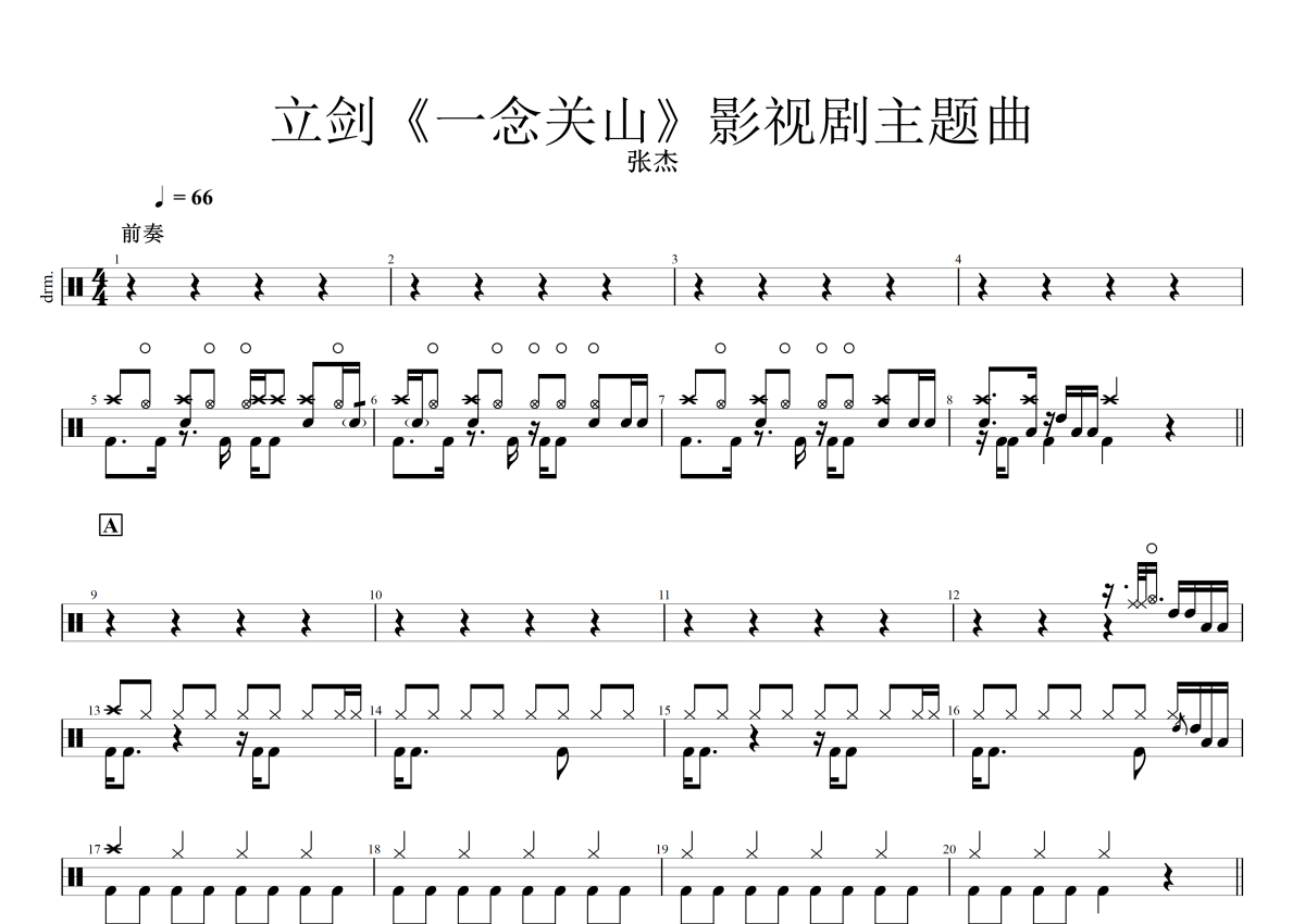 《立剑》是张杰演唱的一首歌曲,拍号为4/4拍,歌曲速度为每分钟66拍,这份架子鼓谱共有两张高清图谱,图谱由 @小东鼓谱 编配上传,图谱使用五线谱编配,使用这份立剑架子鼓谱,你将能够轻松地敲打出这首张杰的立剑,快来尝试吧。
