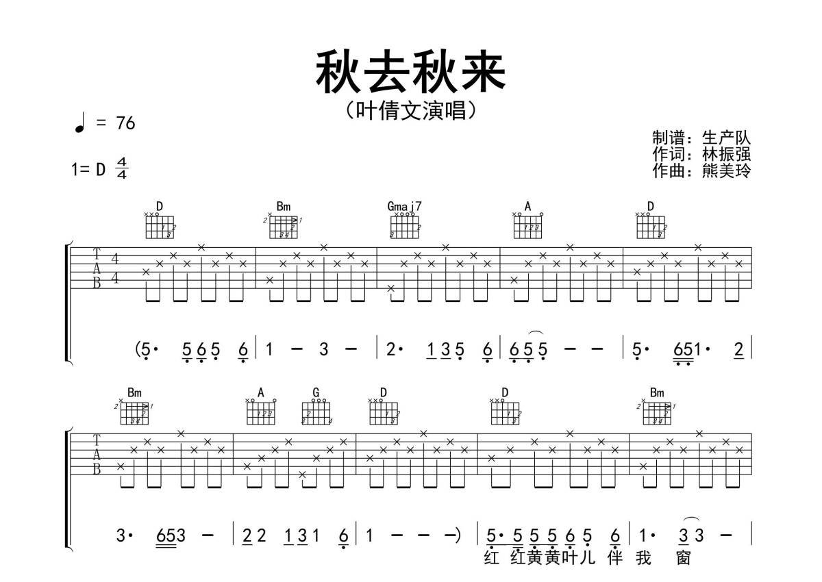 《秋去秋来》是叶倩文演唱的一首歌曲,精编完美版,拍号为4/4拍,歌曲速度为每分钟76拍,歌曲原调为D调,但由于原调指法比较难,为了方便弹奏,本吉他谱采用的是D调指法编配,演奏时不需要使用变调夹即为原调,这份吉他谱共有三张高清图谱,图谱由 @生产队 编配上传,图谱使用六线谱编配,包含吉他和弦指法、简谱以及歌词部分,使用这份秋去秋来吉他谱,可以让你更加方便地掌握这首歌曲的弹唱技巧,快来尝试吧。《秋来秋去》是由熊美玲谱曲,林振强作词,香港歌手叶蒨文演唱的粤语歌曲,收录于叶蒨文1990年发行专辑《秋来秋去》中。本吉他谱根据原版D调指法编配,完整的前奏、间奏、尾奏及solo编配,怀旧经典!。